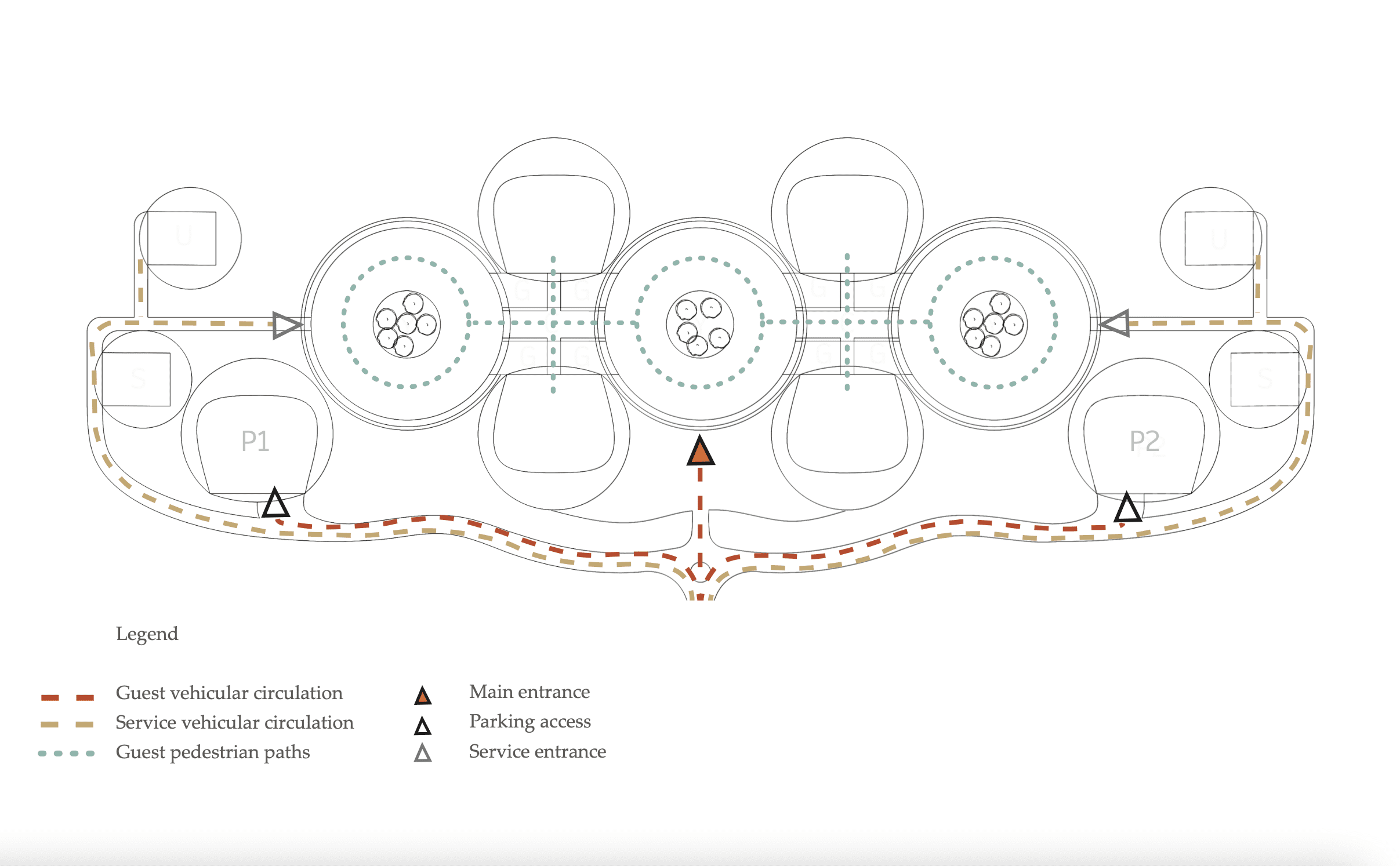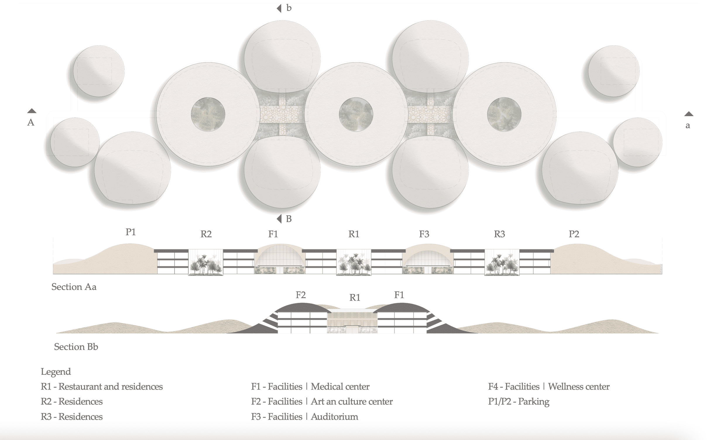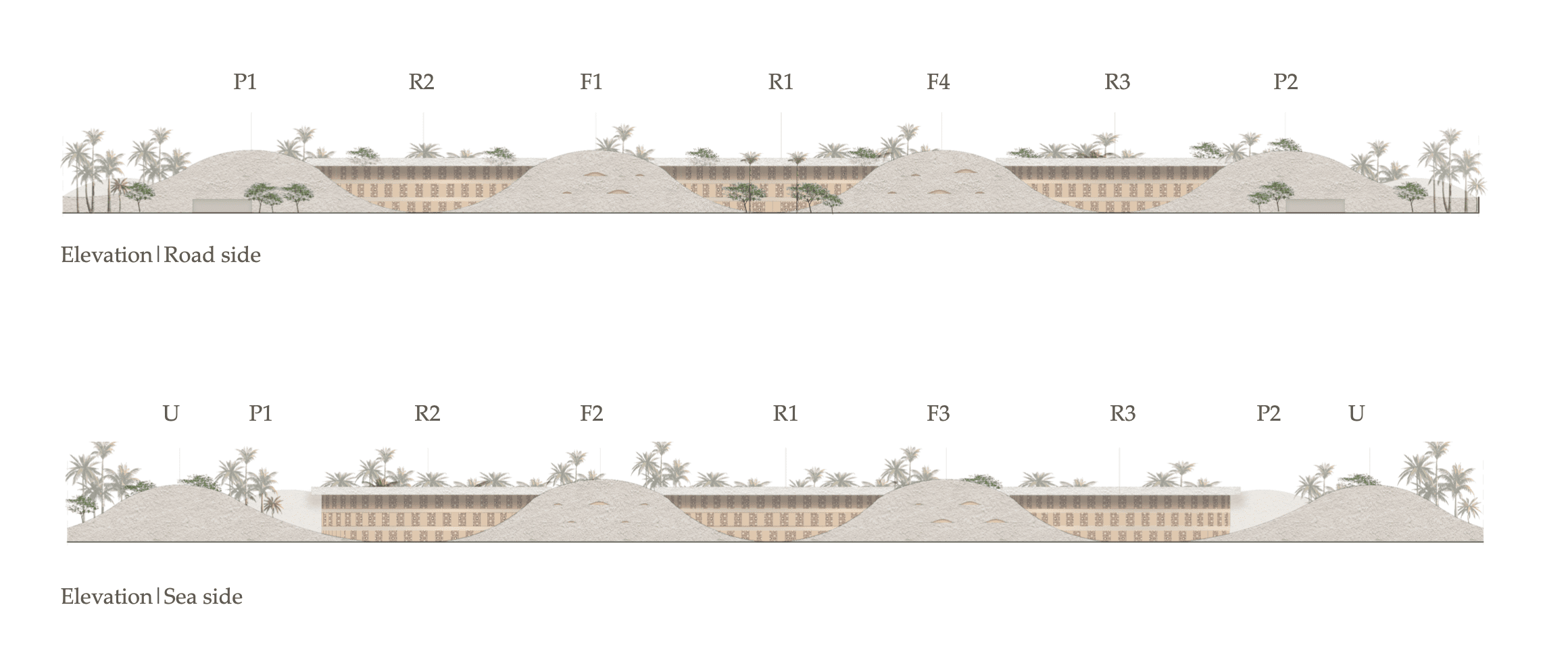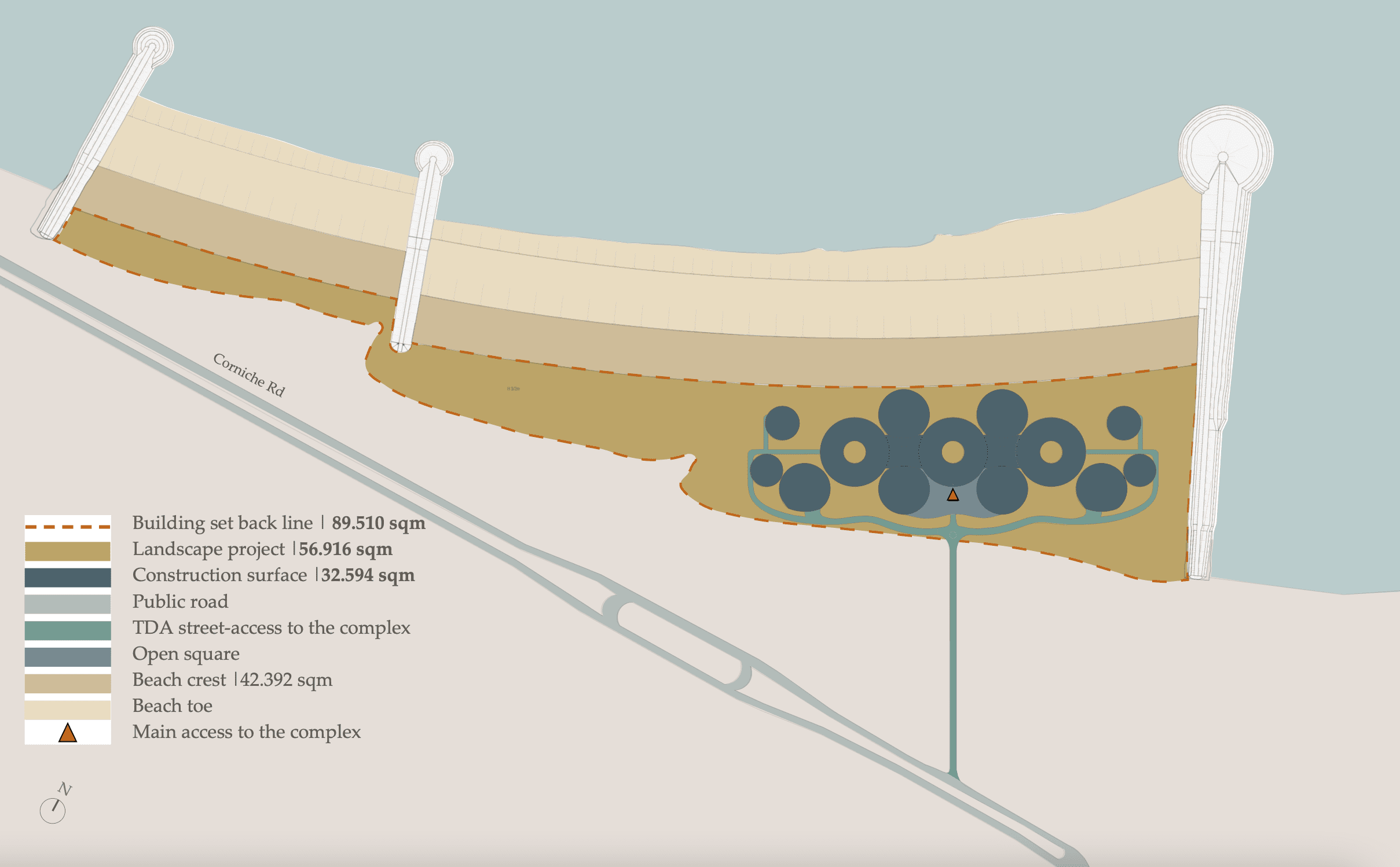 The center will be located in the dune area on a plot of land with an area of 89.510 m2. The construction area of the center is 32.594m2. The total Construction Gross Area is 61.761m2. The project envisages low-rise construction up to 2 stories high, so that the buildings organically merge with the dune strip. All buildings intended for the provision of services are supposed to be the same in terms of construction volume and design and to be placed symmetrically.