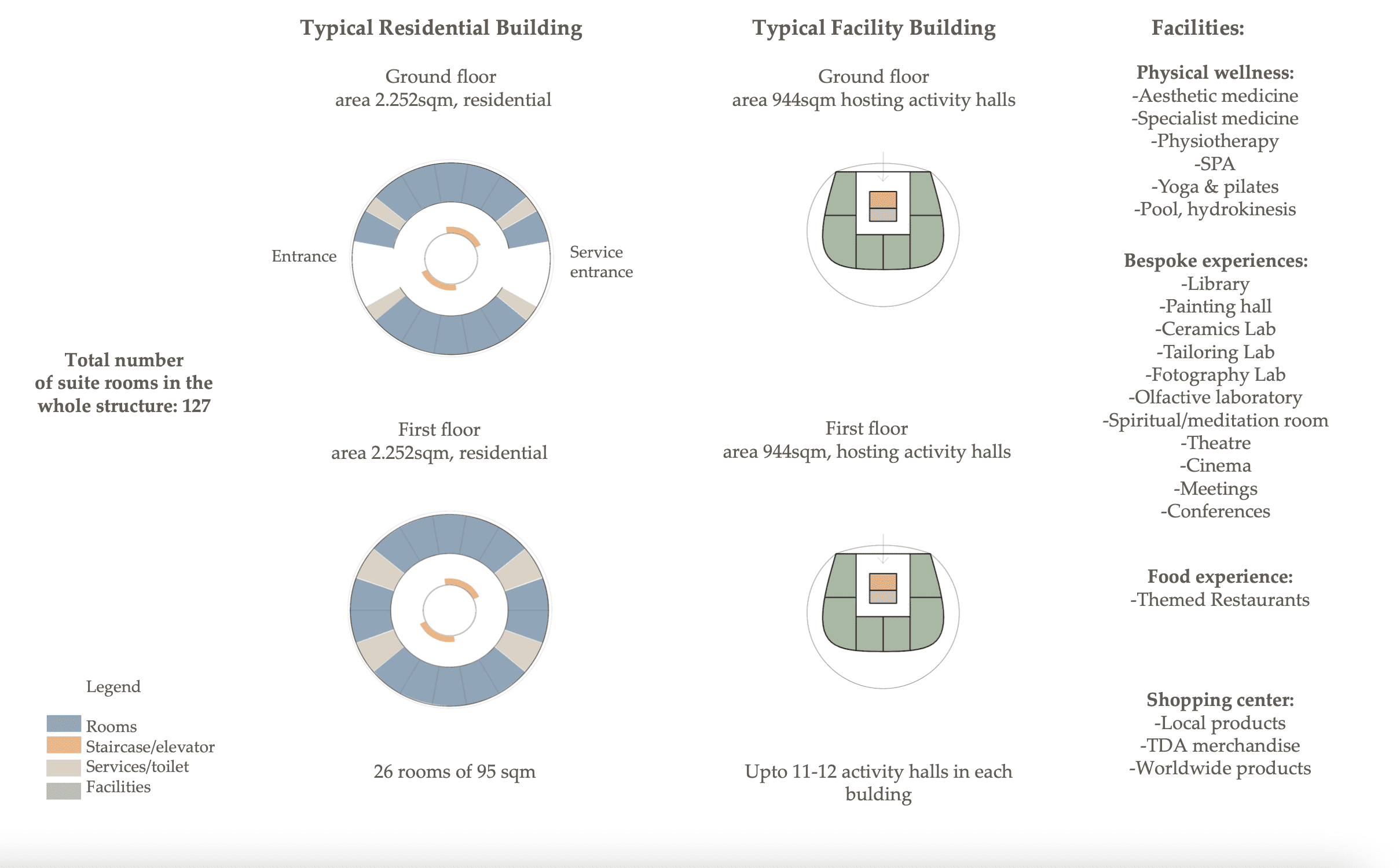 127 rooms with an area of 95 m2 are planned. All rooms are intended for one customer of the center (single occupancy). The customer rooms will be located in 5 symmetrical buildings. The height of each building is 2 floors.